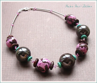 Alpine - duże kule ceramiczne i fimowe, przełożone metalizowanymi koralikami. Wbrew pozorom naszyjnik nie jest zbyt ciężki - jedne i drugie kule są puste w środku.